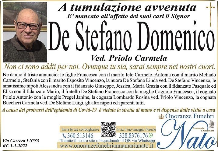 Ne danno il triste annuncio la moglie Domenica Carella, i figli Luciano con la moglie Melania Coletta e Irene, l’amatissima nipotina Rebecca, la cognata Janni Francesca ved. Crupi, i cognati Carella: Giovanni, Mimmo, Sina e Rita con le rispettive famiglie, i nipoti ed i parenti tutti.