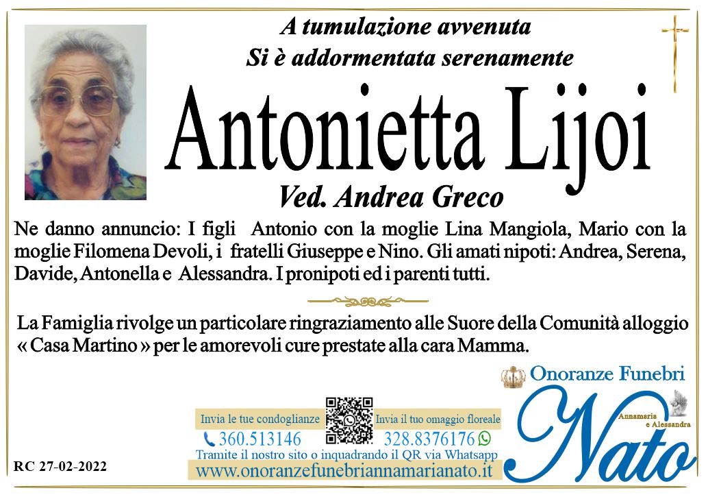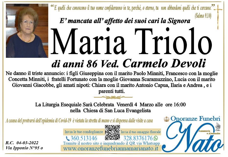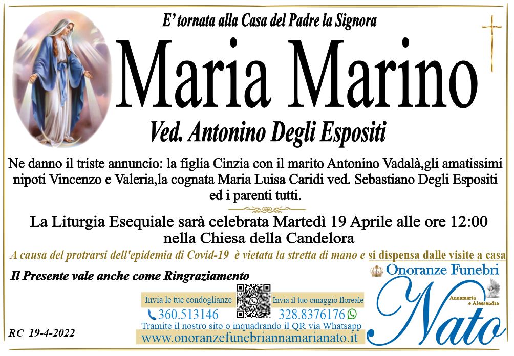 Ne danno il triste annuncio il marito Errigo Eugenio, i figli Mariangela, Anna, Vincenzo con la moglie Squillaci Katina, gli amati nipoti Eugenio, Michele, Maria Chiara,Valeria, Maria Pia, i fratelli: Leonardo, Salvatore, Antonino e Maria con le rispettive famiglie, i nipoti ed i parenti tutti.