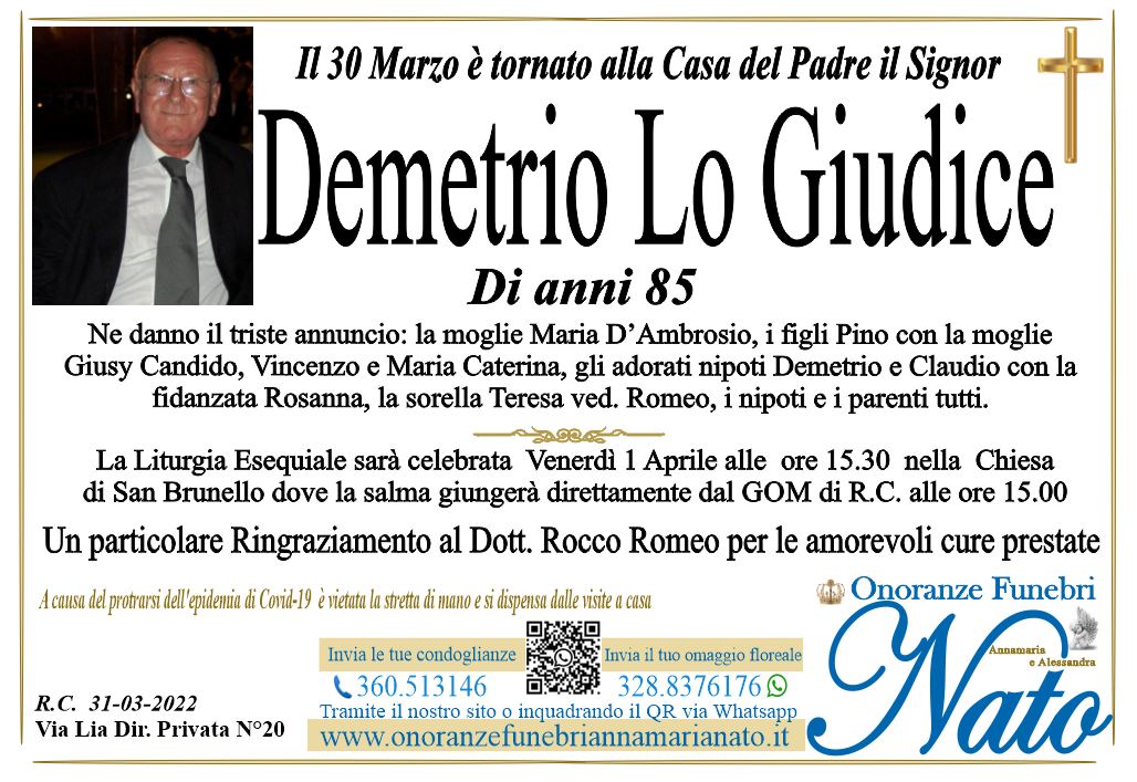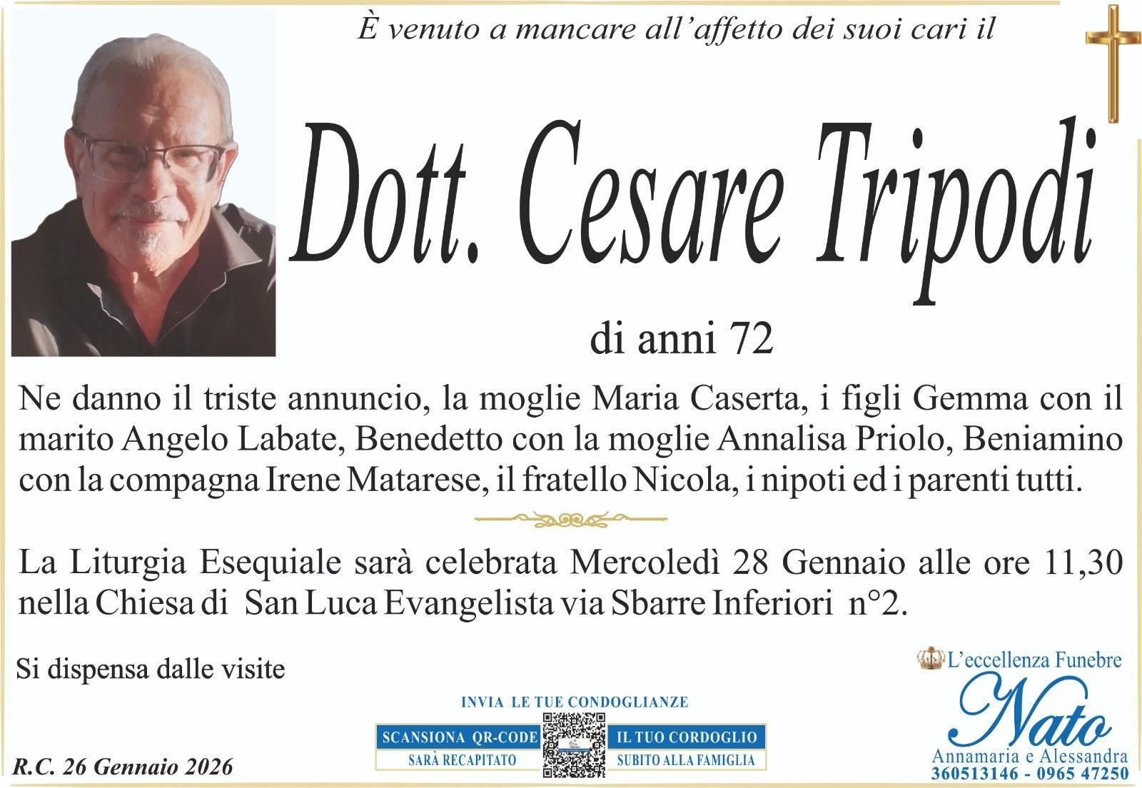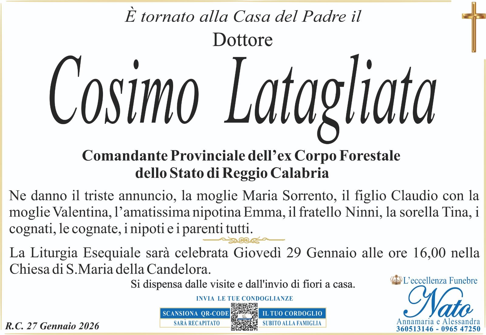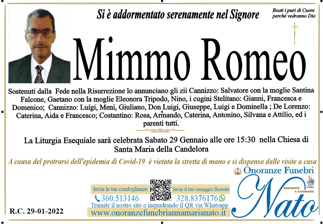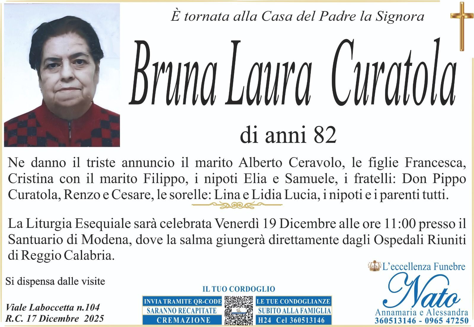 La Liturgia Esequiale sarà celebrata Lunedì 6 Agosto alle ore 11.00 nella Chiesa di Santa Maria della Candelora di Reggio Calabria. Il presente vale anche come ringraziamento