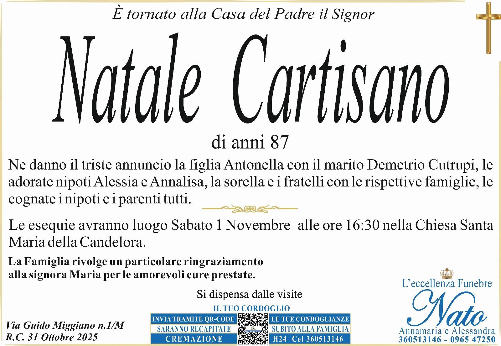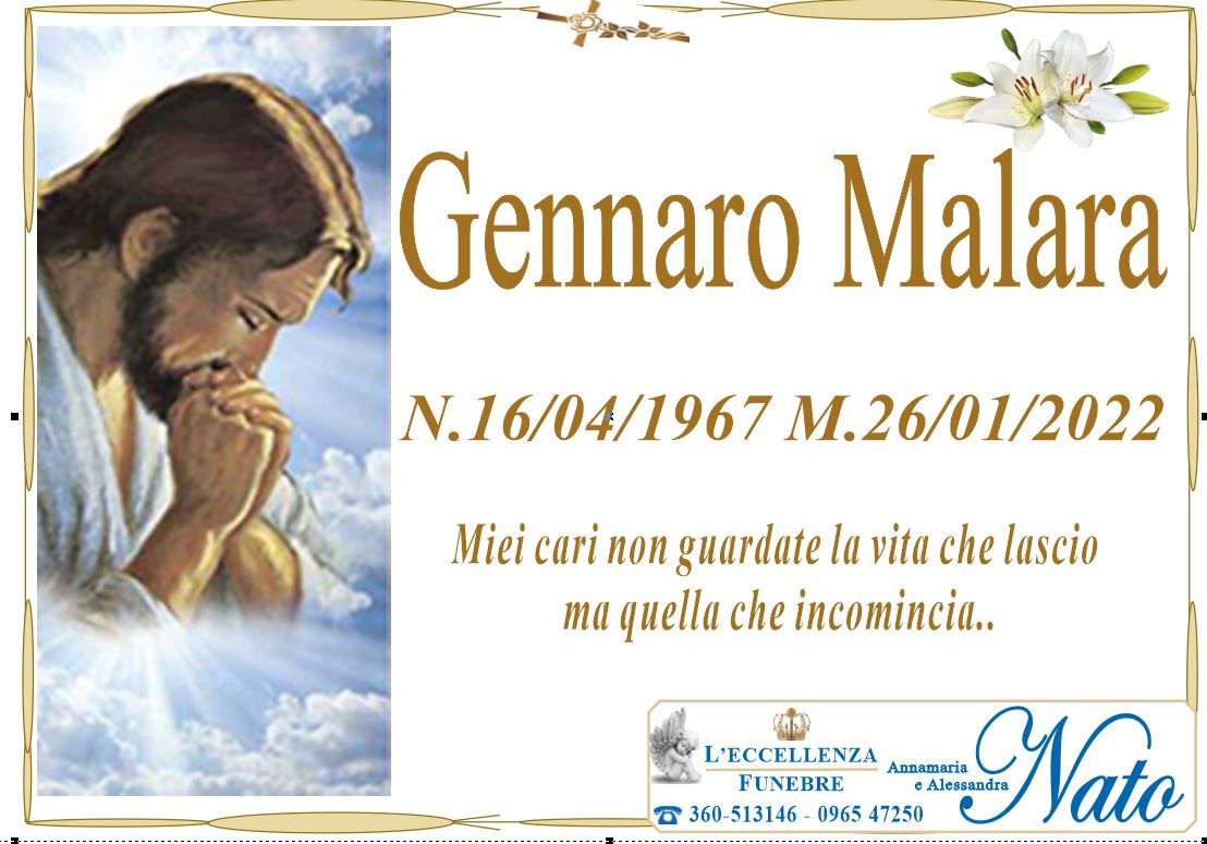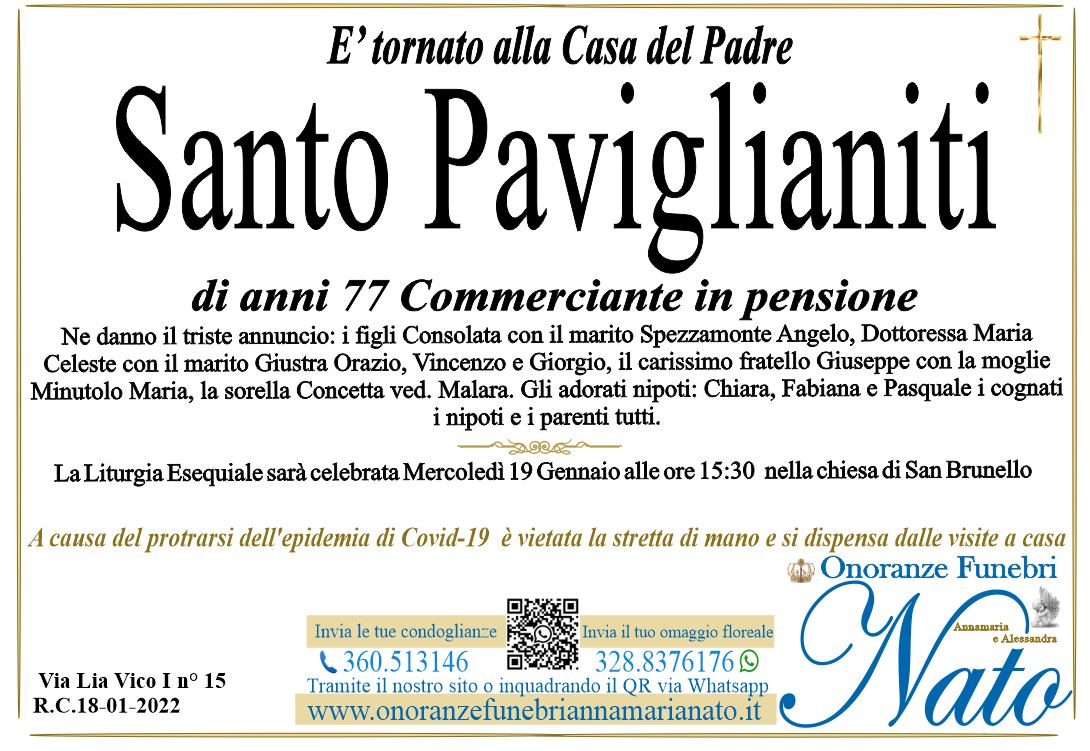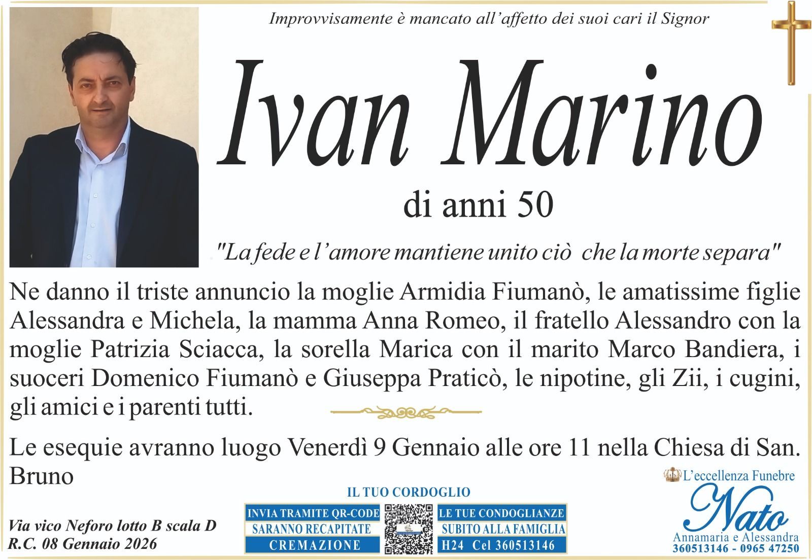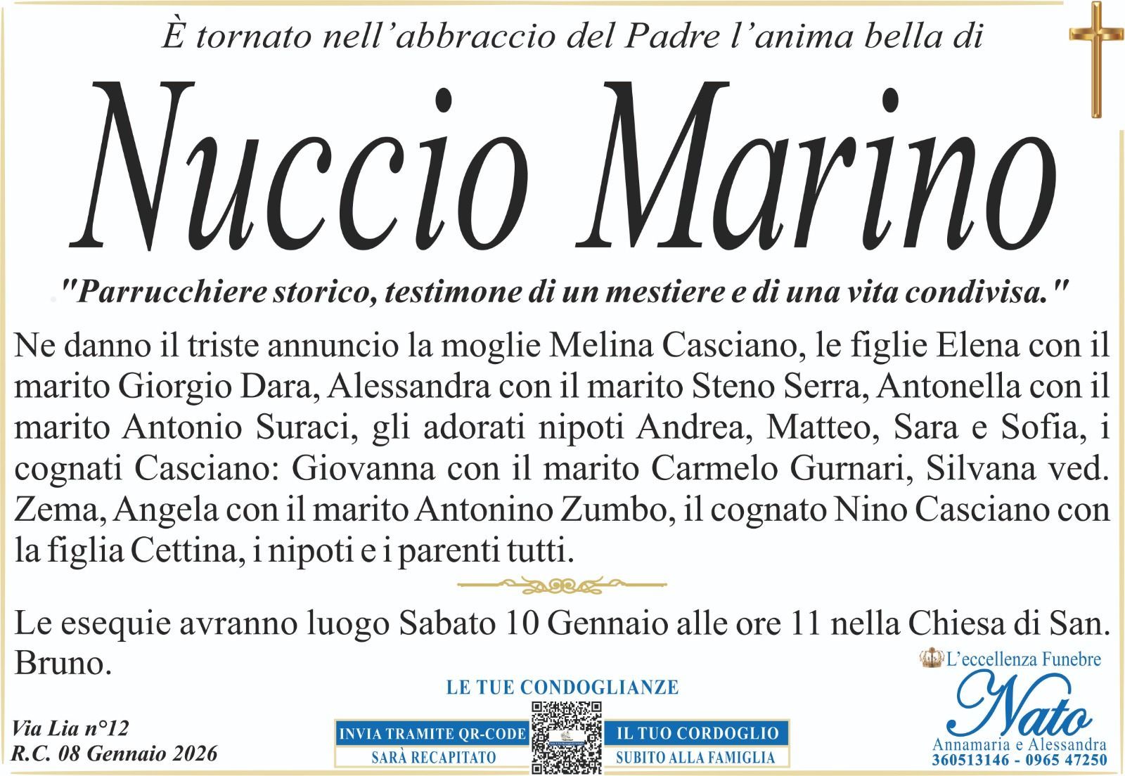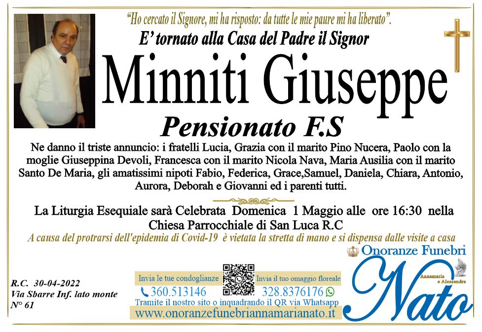 Ne danno il triste annuncio la moglie Giuseppina Puntorieri, le figlie Rubina con Giuseppe Lazzara, Noemi con Giovanni Cristiano, il padre Giovanni, i fratelli Gennaro con la moglie Francesca Modafferi, Pasquale con la moglie, i cognati Filippo, Arianna con il marito Antonino Gelsomino, gli zii, i nipoti, i cugini ed i parenti tutti.
