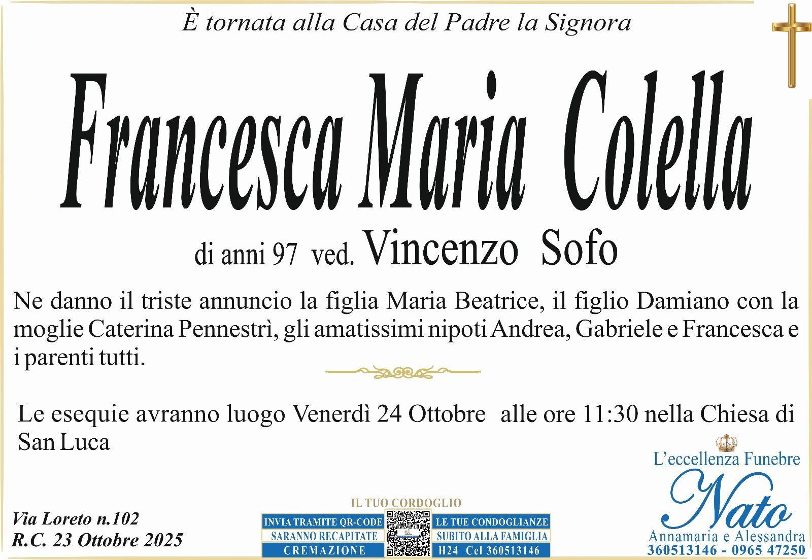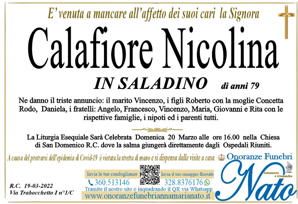 Ne danno il triste annuncio il marito Sterminio Domenico, i figli Filomena con il marito Cilione Antonino, Alfredo con la moglie Maria Pia Postorino, Lucia ved Furci Giuseppe, Francesca con il compagno Carmelo Cotrupi, Maria, Virginia con il marito Siclari Silvano, i fratelli e le sorelle Maria ved. Modafferi Domenico, la cognata Modafferi Maria Antonia ved. Leggio Antonino, Filomena con il marito Marte Antonio, Buonaventura ved. Ritorto Teresa, Paola ved. Astore Raffaele, Domenica con il marito Morabito Leo, la sorella Staiti Fortunata, la cognata Moio Antonia ved. Staiti, la cognata Cotroneo Antonia ved. Sterminio Giovanni, il genero Umberto Munaò, il caro Candido Giuseppe, i nipoti ed i parenti tutti.