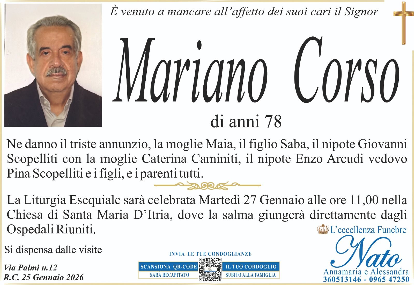 La Liturgia Esequiale avrà luogo Venerdì 1 Ottobre alle ore 15:30 nella Chiesa dell’ Itria ove la salma giungerà direttamente dall’ Ospedale Morelli