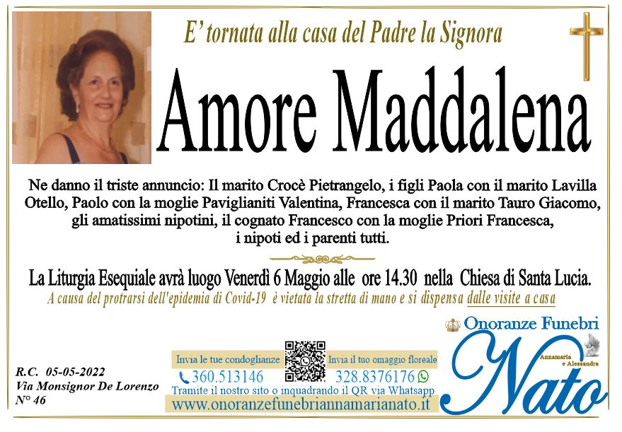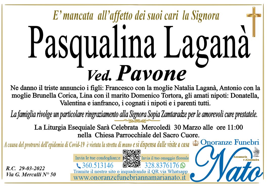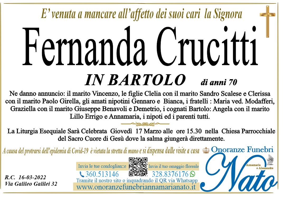Ne danno il triste annuncio i figli: Rosanna e Salvatore con la moglie Doretta Pansera, il fratello Pasquale, i cognati Spina: Emilia con il marito Tommaso Serafini e Luigi, la cara cugina Maria Pizzi con il marito Francesco Giunta ed i parenti tutti, La Liturgia Esequiale sarà celebrata Venerdì 15 Giugno alle ore 16.00 nella Chiesa di Santa Maria dell'Itria, dove la salma giungerà dagli Ospedali Riuniti.