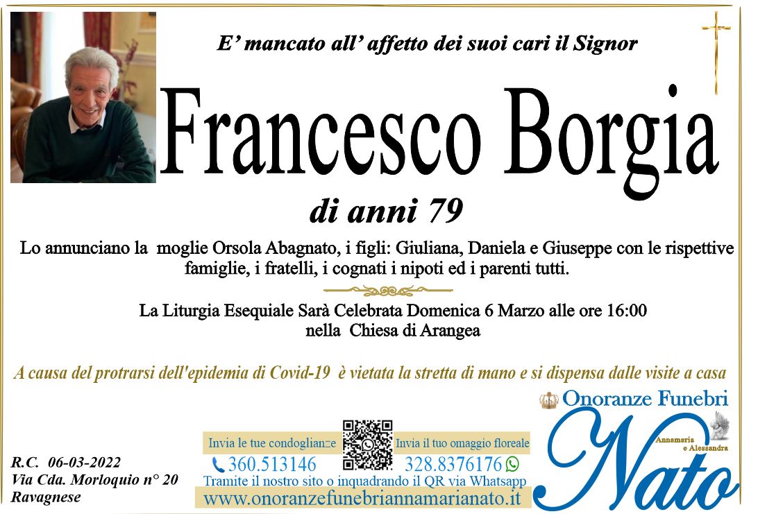 Ne danno il triste annuncio: La moglie Rosa Siciliano, i figli Francesco, Paolo e Roberto, i nipoti Alice, Andrea e Riccardo e i parenti tutti.