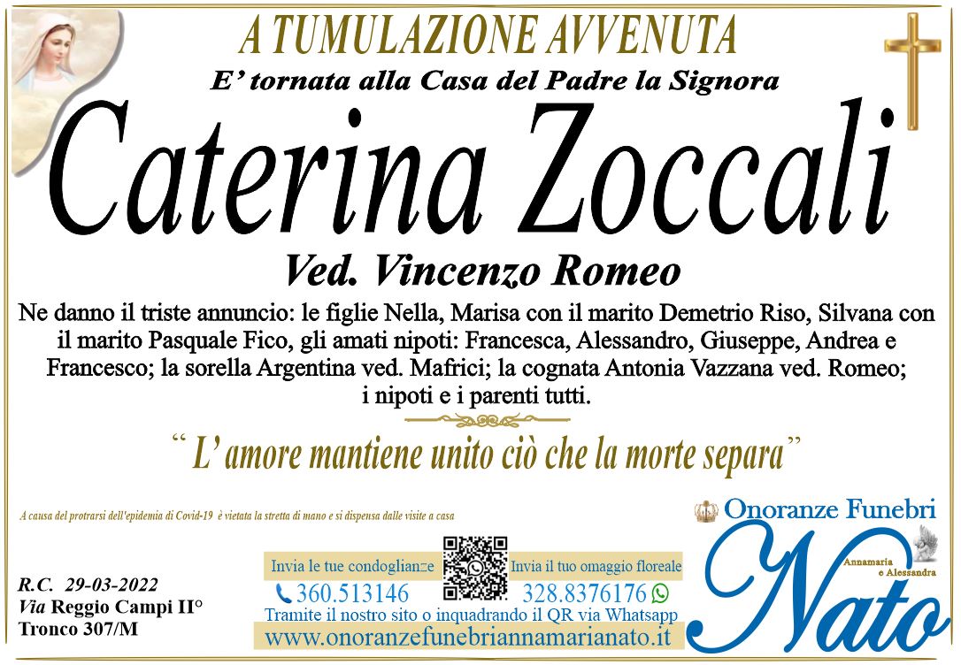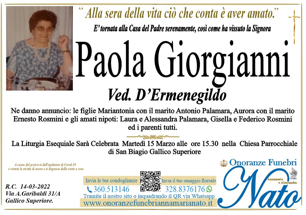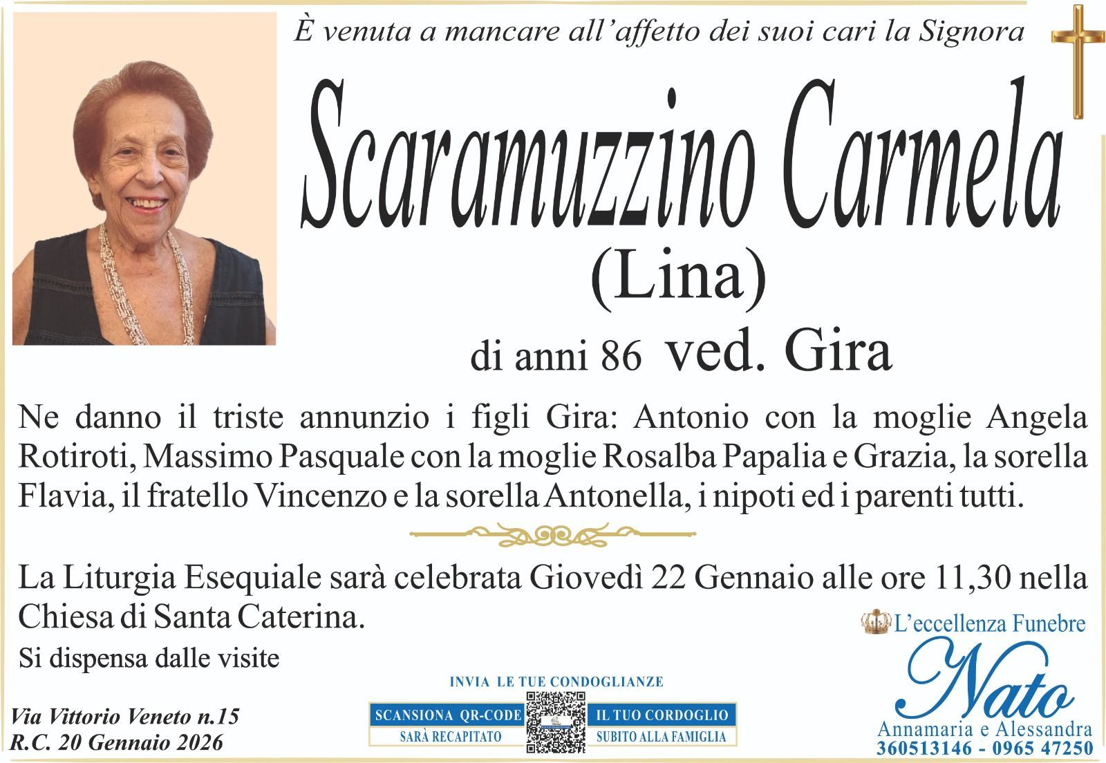 Ne danno il triste annuncio il figlio Natale, la nuora Claudia Mammana ved. Antonio Arcuri con le nipoti Marcella e Agnese con il marito Rosario Foti, la sorella Nuccia Sapone ved. Vago con la figlia Giusy, i nipoti e i pronipoti ed i parenti tutti.