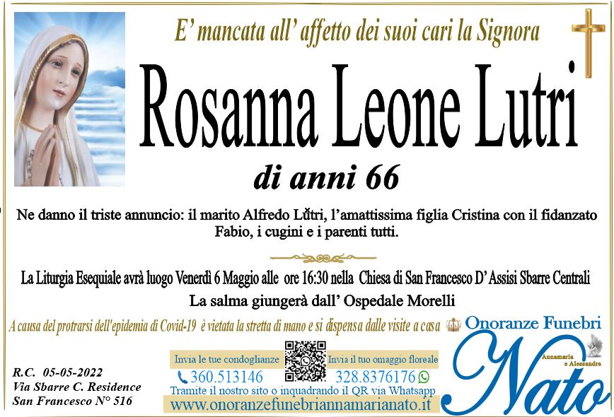 Ne danno il triste annuncio il marito Paolo, i figli Mary con il marito Alessandro Rosace, Giovanni con la moglie Antonella Nigero e Sergio Maria, le sorelle Maria ved. Diego Palma, Antonia con il marito Pino Scaramuzzino, Luisa con il marito Antonio Panella, il cognato Antonio Scopelliti con la moglie Giuseppina Ciliberto, le amatissime nipotine Aurora, Silvia e Marta, gli altri nipoti, i cugini ed i parenti tutti.