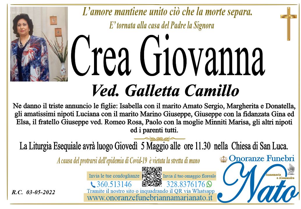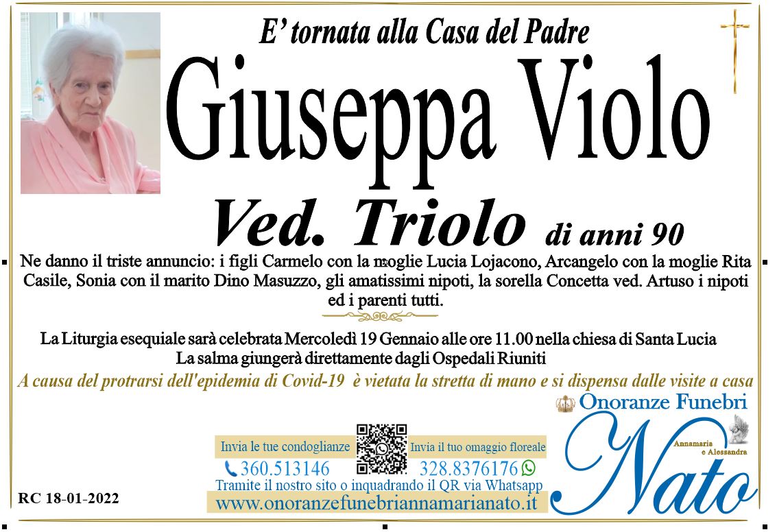 Ne danno il triste annuncio i figli: Francesca ved. Sicari, Vincenzo con la moglie Angela Triglia, Marco con la moglie Caterina Crupi, Maria e Giovanni, i cari nipoti Paolo, Giovanna, Daniele, Gaetano, Giuseppe e Davide, i pronipoti Emanuele e Adriano , gli altri nipoti ed i parenti tutti.