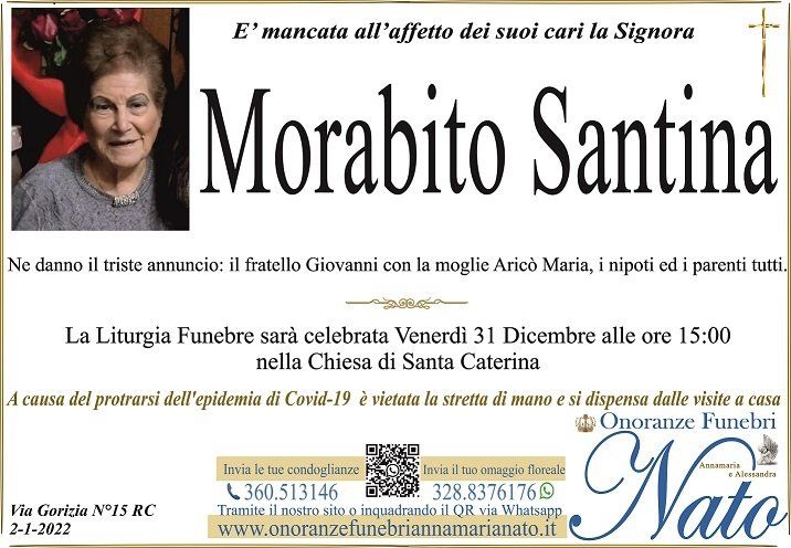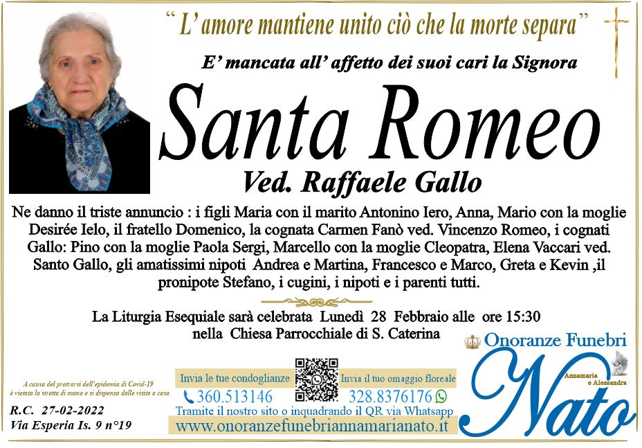 Ne danno il triste annuncio: la figlia Maria Pia con il marito Sterminio Alfredo, gli adorati nipoti Domenico e Anna Maria, la sorella Santoro Maria, la cognata Macrì ved. Santoro, gli altri nipoti ed i parenti tutti.