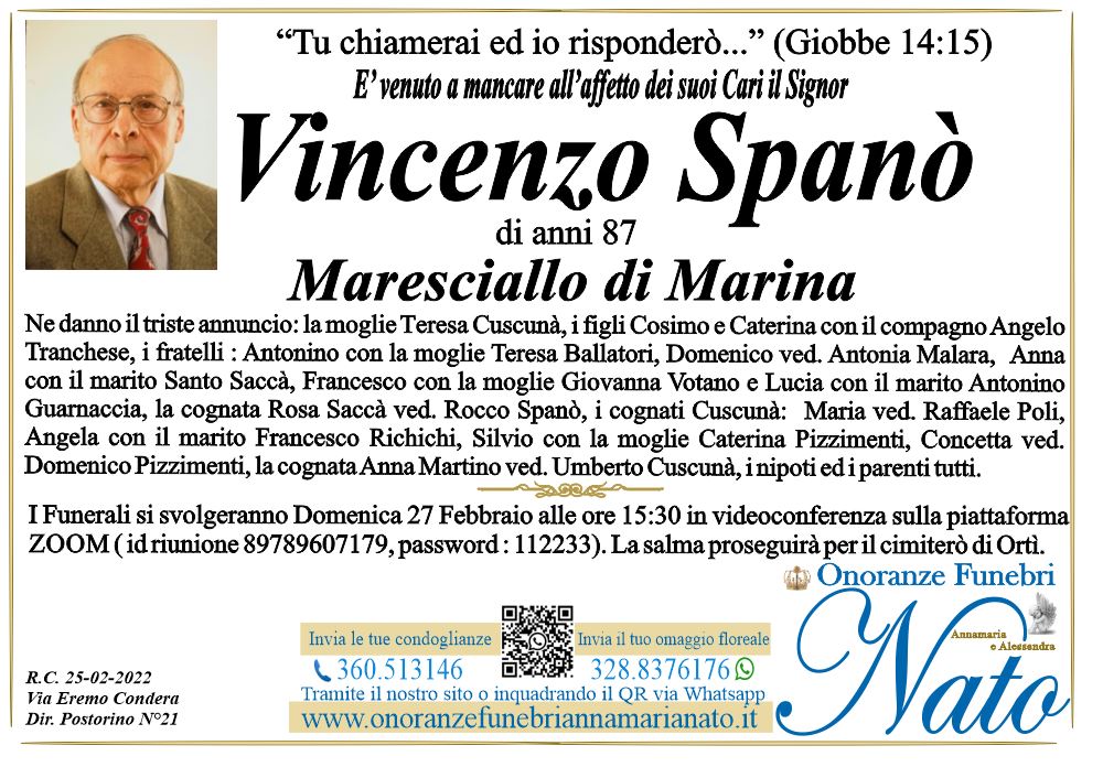 Ne danno il triste annuncio i figli: Fortunato, Giovanni con la moglie Orsola Silicato, Giuseppe con la moglie Caterina Mancuso, Francesco con la moglie Rossella Macchione, gli amati nipoti: Antonella, Vincenzo, Roberto, Enrico e Rita,il fratello Orazio con la moglie Maria Ripepi, i nipoti ed i parenti tutti.